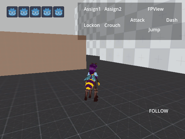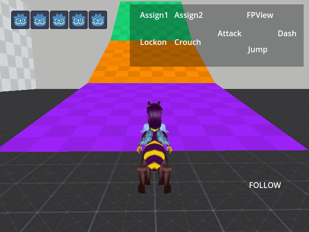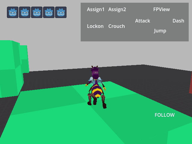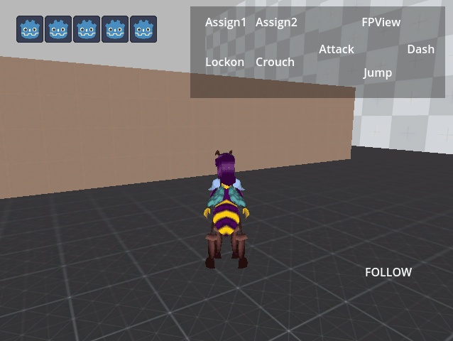 In addition, the offset had to be accommodated by the variable distance between the camera and the player, which resulted in awkward positioning and clipping and became unwieldy when the player takes manual control. However, the reason I ultimately cut the feature is as I was testing the various options I found myself too often drifting to the joystick to wrestle control away, which contradicts my reason for trying it in the first place.